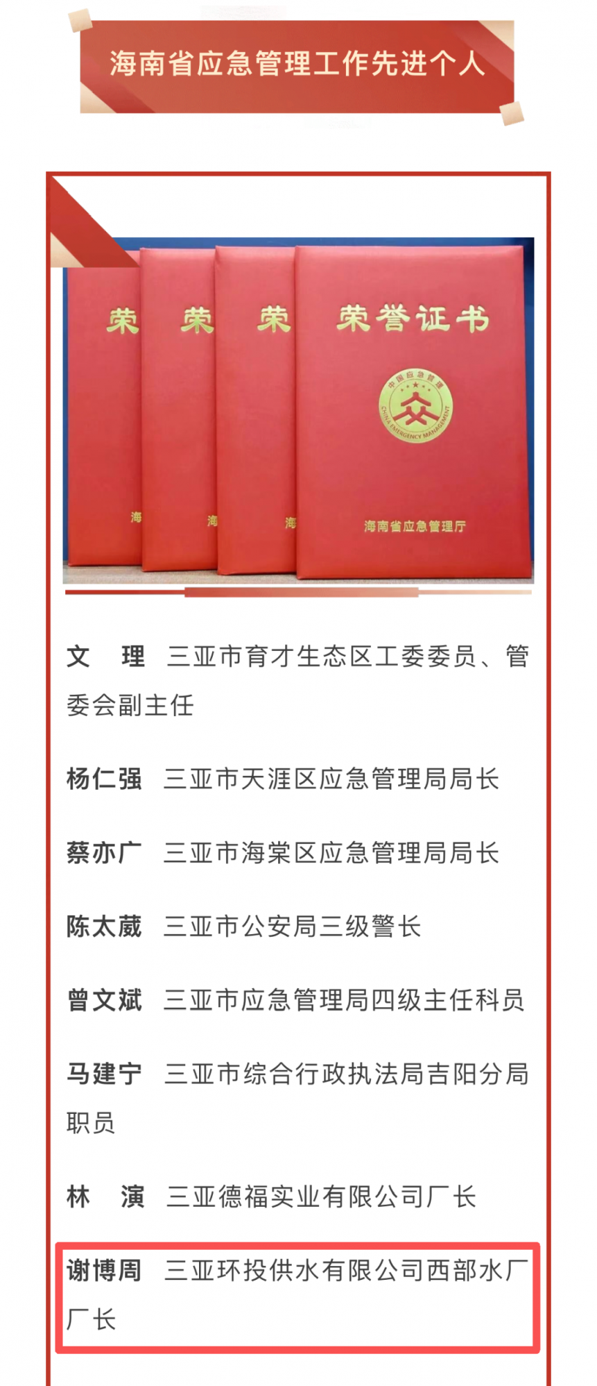 近日,海南省應急管理廳公布全省應急管理工作先進(jìn)集體和先進(jìn)個(gè)人名單,對在全省應急管理領(lǐng)域作出突出貢獻的集體與個(gè)人予以表彰。其中,三亞環(huán)農集團旗下三亞環(huán)投供水有限公司西部水廠(chǎng)廠(chǎng)長(cháng)謝博周榮獲“海南省應急管理工作先進(jìn)個(gè)人”稱(chēng)號。