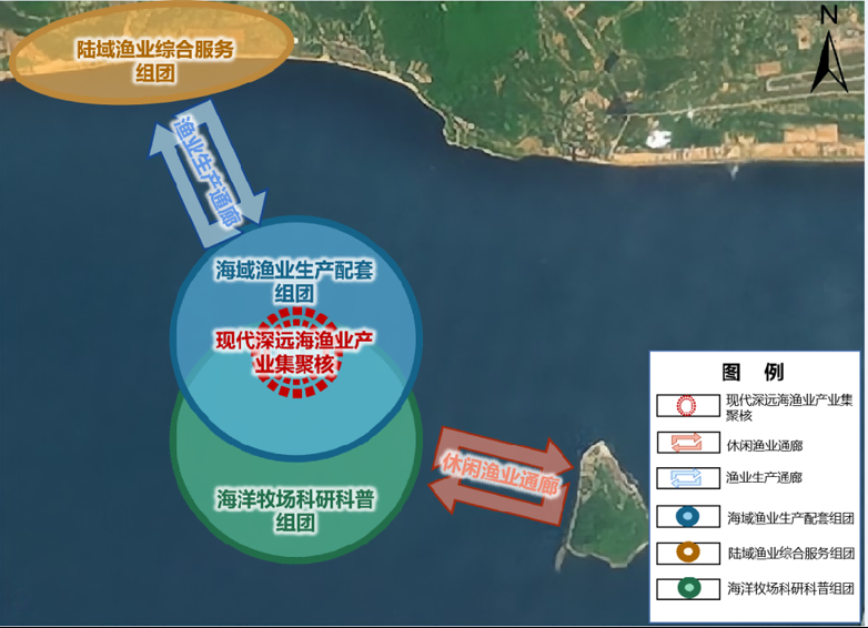 △ 三亞海上現代漁業(yè)產(chǎn)業(yè)園“一核心-兩通廊-三組團”規劃布局