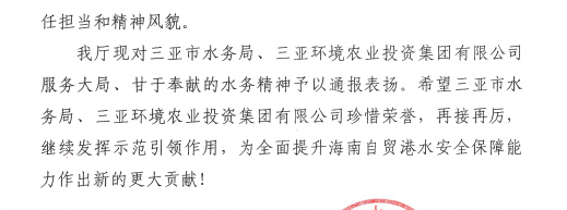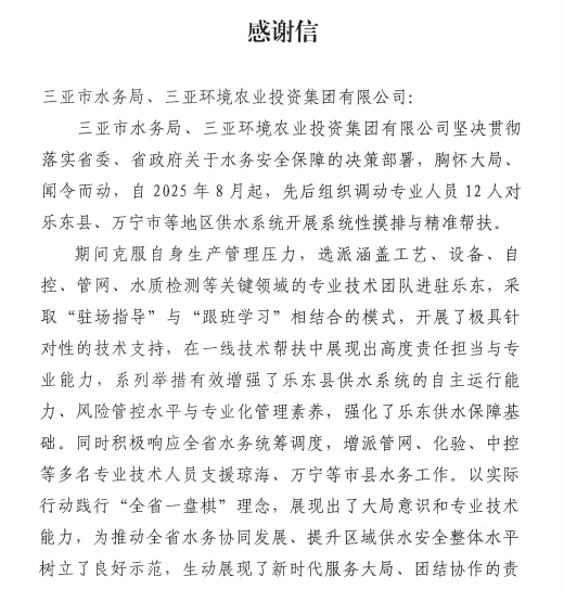 近日,省水務(wù)廳向三亞環(huán)農(nóng)集團發(fā)來感謝信,對集團在支持樂東等市縣供水技術(shù)提升、積極響應(yīng)全省水務(wù)調(diào)度安排中作出的貢獻(xiàn)給予高度肯定。信中指出,三亞環(huán)農(nóng)集團堅決貫徹全省水務(wù)工作部署,統(tǒng)籌指導(dǎo)下屬單位落實對口支援任務(wù),以實際行動踐行“全省一盤棋”理念,為強化區(qū)域供水保障、推動全省水務(wù)事業(yè)協(xié)同發(fā)展樹立了榜樣。
